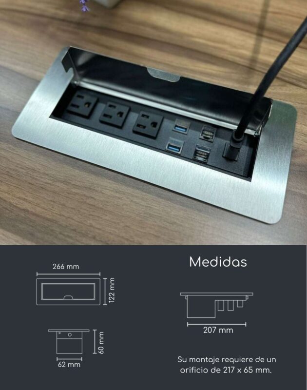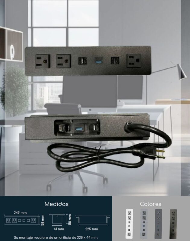 Su sistema de apertura es manual mediante una puerta que nos ayuda a ocultar los contactos cuando no son utilizados. Fabricado en Acero con recubrimiento de pintura electrostática las cual nos ayuda a proteger la calidad y tiempo de vida del color.