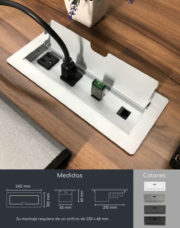 Su sistema de apertura es manual mediante una puerta que nos ayuda a ocultar los contactos cuando no son utilizados. Fabricado en Acero con recubrimiento de pintura electrostática las cual nos ayuda a proteger la calidad y tiempo de vida del color.