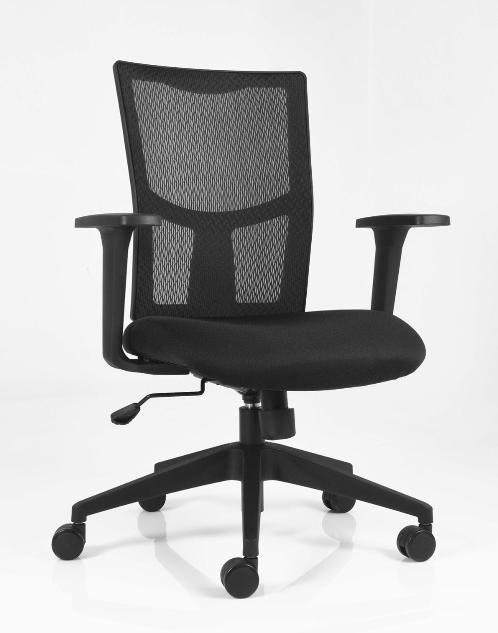 Asiento Fabricado en madera domada y contrachapada de 16mm, conformado por 9 capas de chapa de madera Acojinamiento Con espuma de poliuretano inyectado moldeado con 53 kg de densidad, con 8cm de grosor Asiento tapizado En tela Brazo Fijo de polipropileno negro Mecanismo Synro, ajustable de altura, desbloqueo de reclinacion y perilla para tension de respaldo Piston Neumatico para ajuste de altura Base Piramidal en nylon con fibra de vidrio color negro Rodajas Doble rueda de 60mm en nylon