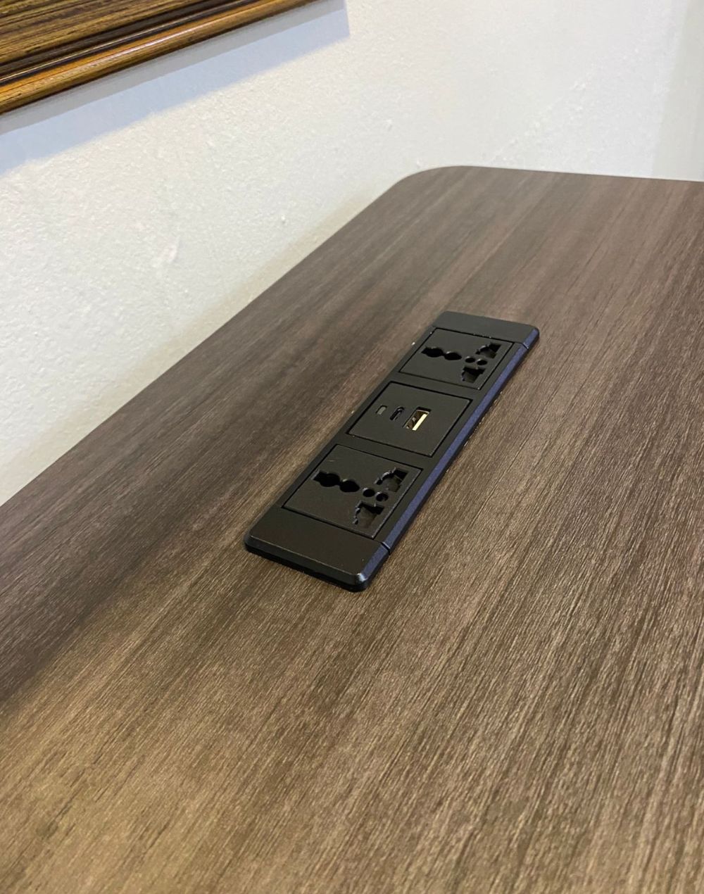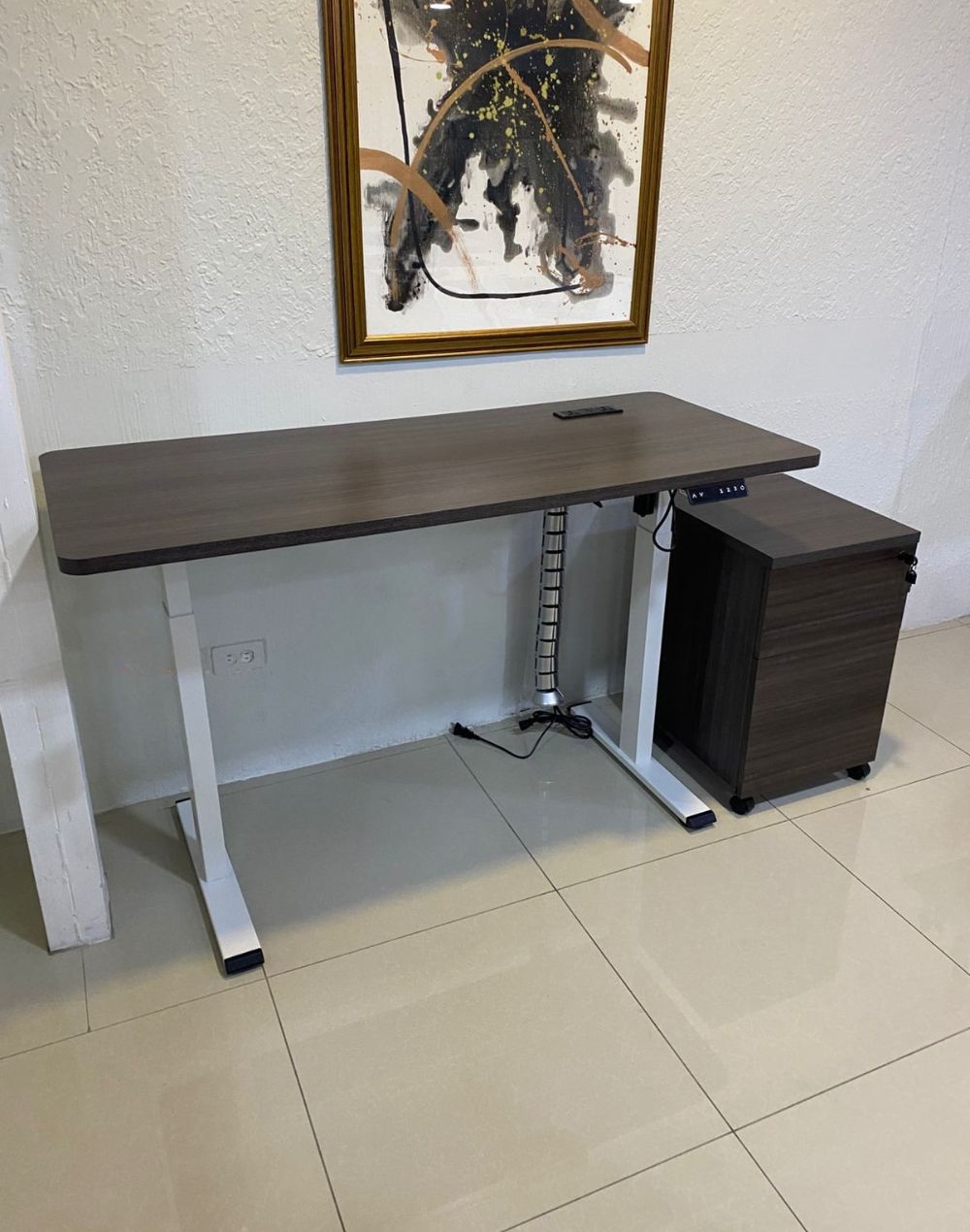 Multicontacto Con 3 puertos (2 clavijas, 1 conexion USB)Cajonera Movil con rodajas y cajones ( 1 papelero + 1 archivo ) Pasacables Flexible tipo gusano Estructura De Acero pintada con recubirmento en polvo electrostatico Control Con 3 altura programables Tonos disponibles Nogal Britanico, Olmo Volga, Roble Renovales (en imagen)
