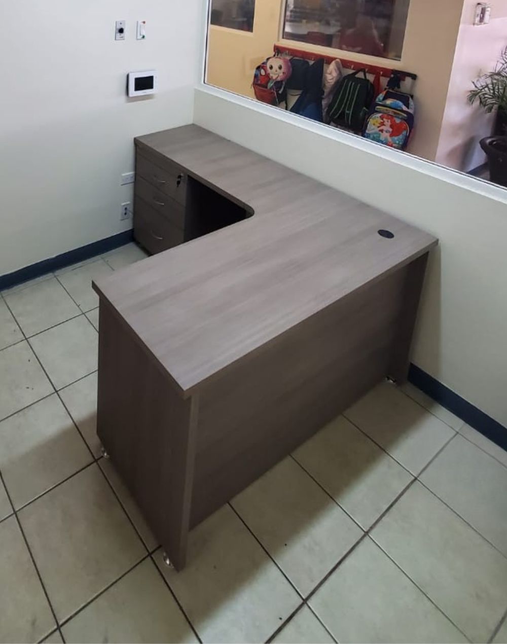 Escritorio Curvo incluye un pedestal de 3 gavetas (2 papeleras y 1 de archivo), chapa de seguridad y jaladeras 1/2 luna, con una perforación pasa cables en la cubierta y con pantalla hasta el piso remetida 10 cm