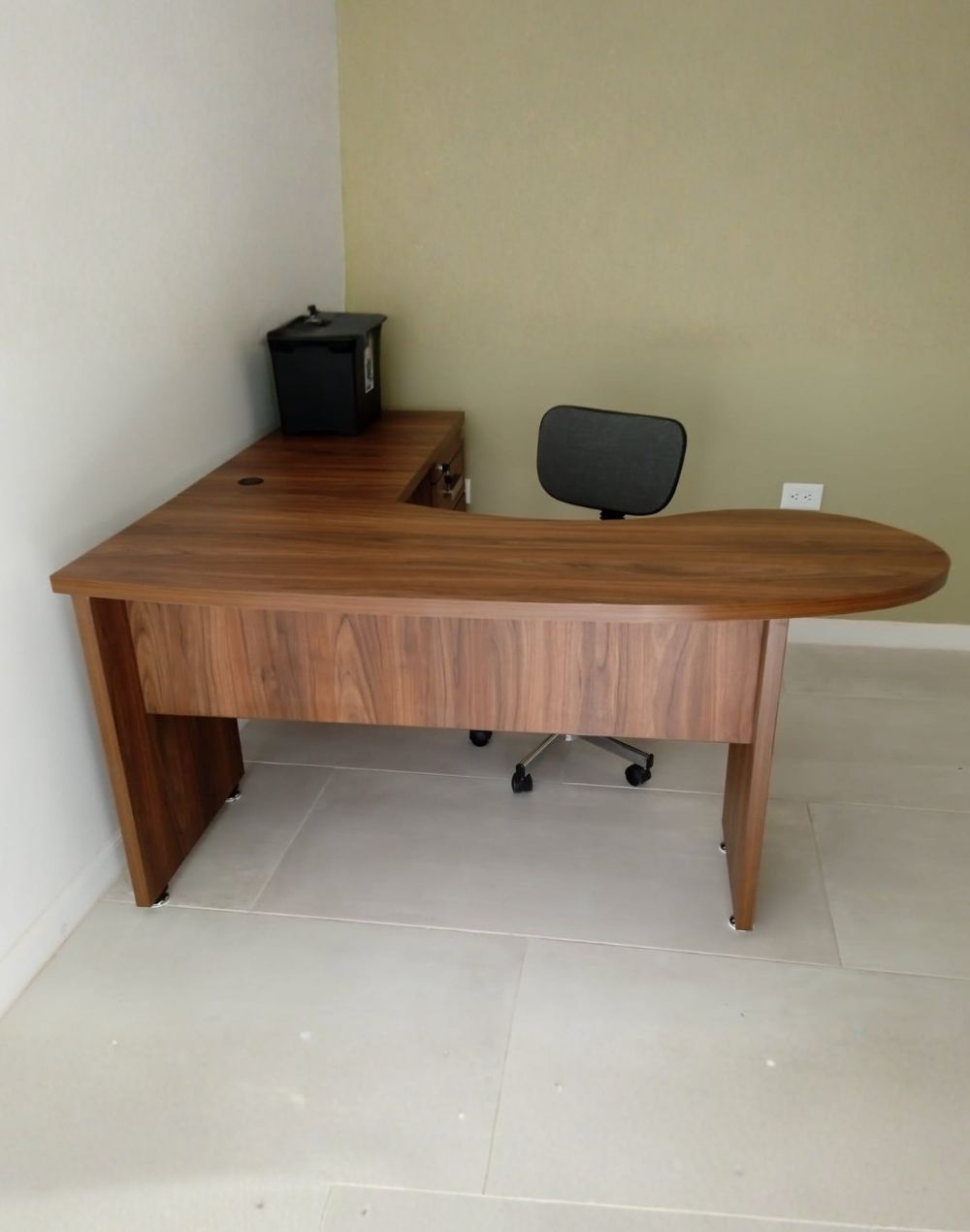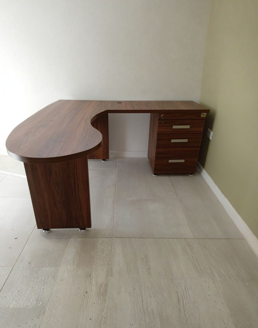 Escritorio tipo gota hacia afuera de 1.50m de frente x .60cm de fondo x .75cm de alto, tamaño de la gota .90cm de diametro, pantalla media y soporte plano