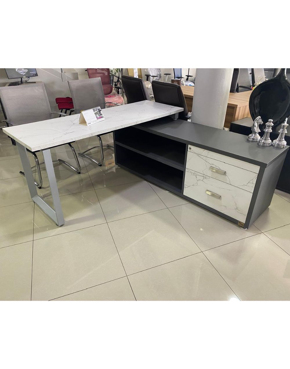 Base metálica modelo malaga para escritorio del otro lada descansa sobre credenza
